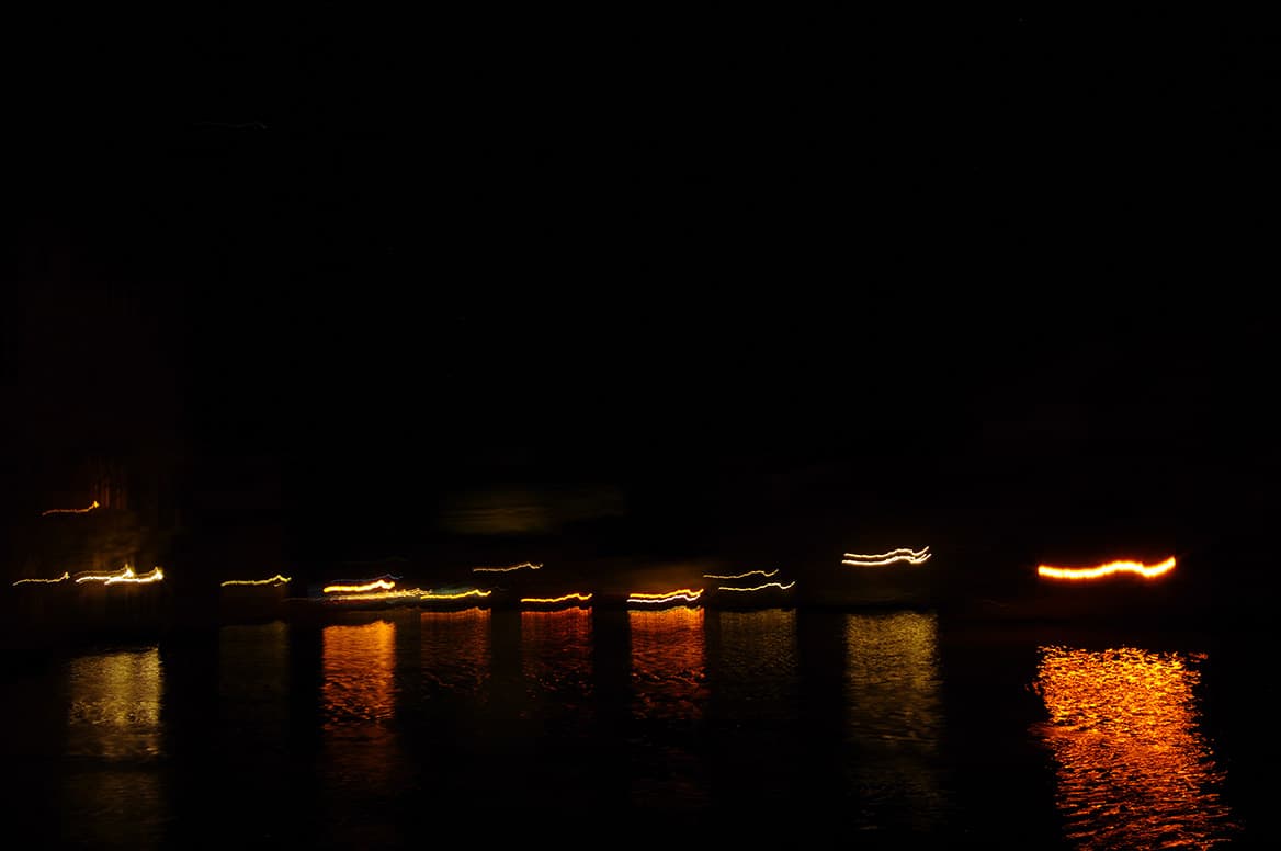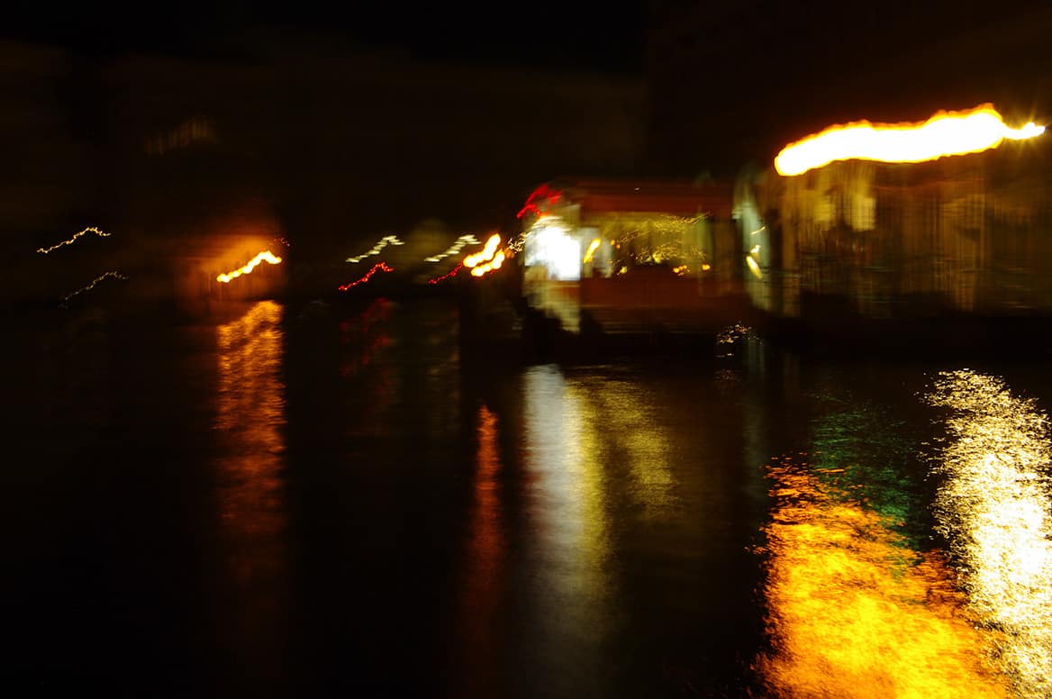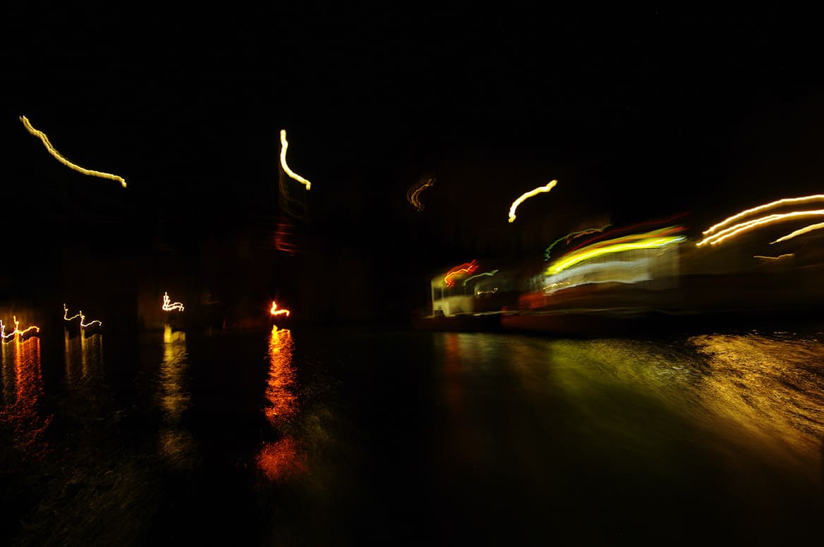 Cette série de photos a été prise depuis le Vaporetto sur un trajet entre Mestre et le pont du Rialto. Suivant le protocole précis des séries genius loci, les mouvements sont ceux du bateau et des ondulations des vagues; les lumières, celles des lieux touristiques de la ville, de la place St Marc et des palais du Grand Canal, transfigurés. Les photos sont livrées « brutes », sans retouches ni lumières ajoutées, comme s'il s'agissait du résultat d'une mesure scientifique, l'empreinte pure des photons de Venice sur le capteur de l'appareil photo emporté dans le flux de la ville. Dans ce travail, il est essentiel que la photo soit le témoin le plus authentique de ce qui s'est passé, une traduction directe du réel, et non pas une construction fictionnelle de l'artiste. Le spectateur a ainsi toute la liberté de construire sa propre interprétation.