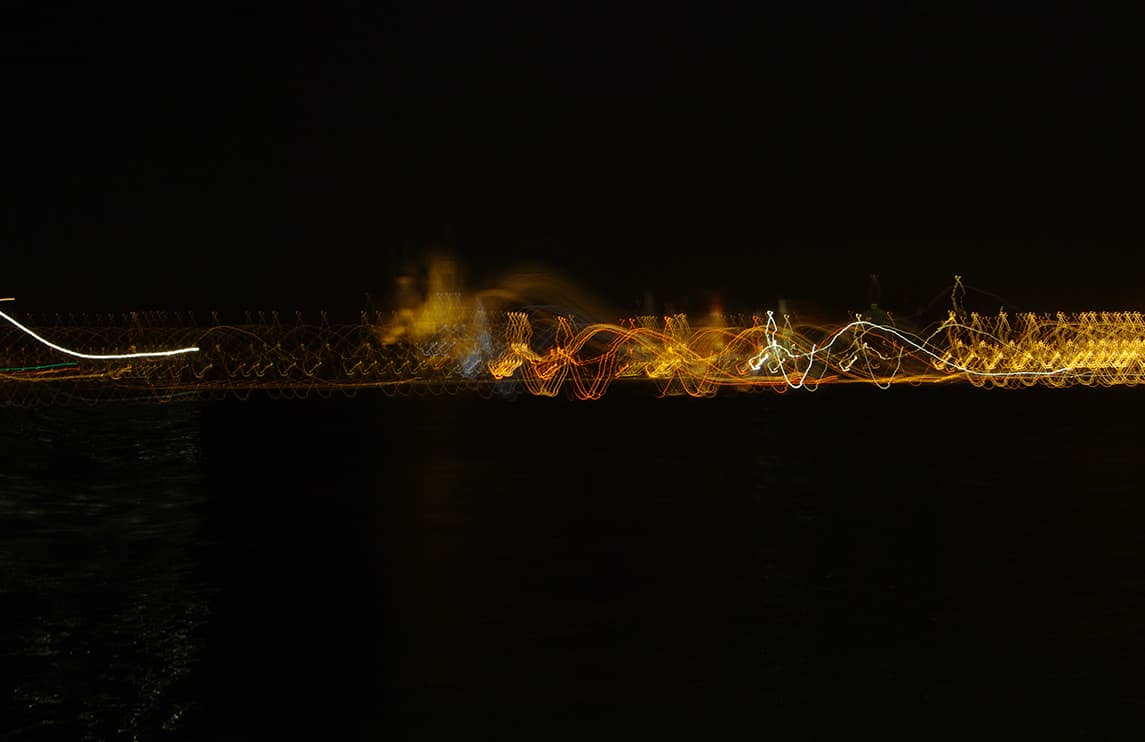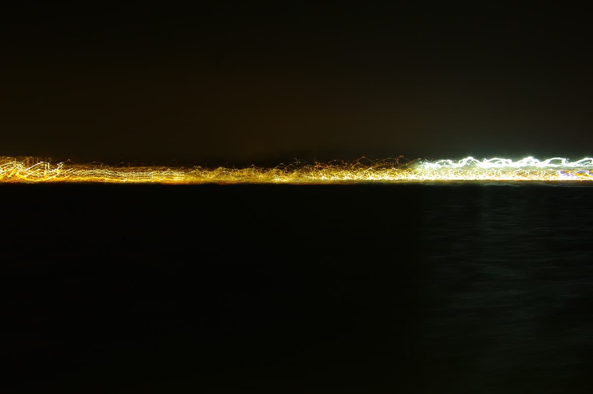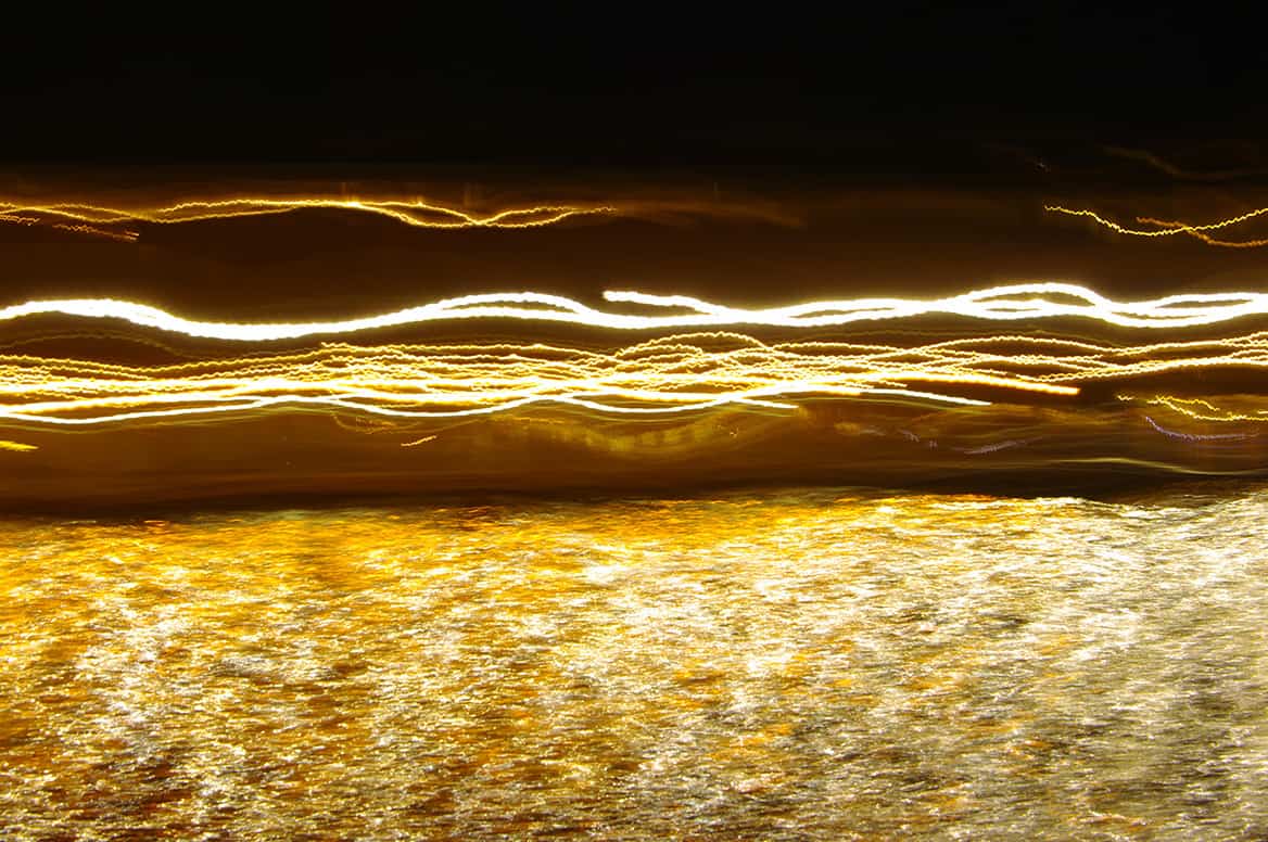 Cette série de photographies a été prise à Venise, sur un trajet en Vaporetto entre Mestre et le Rialto. Les images suivent un protocole précis et rigoureux. Elles sont « brutes », sans retouches ni lumières ajoutées, comme s’il s’agissait du résultat d’une mesure scientifique, l’empreinte directe des photons émis par la ville sur le capteur de l’appareil photo emporté par les mouvements du Vaporetto.