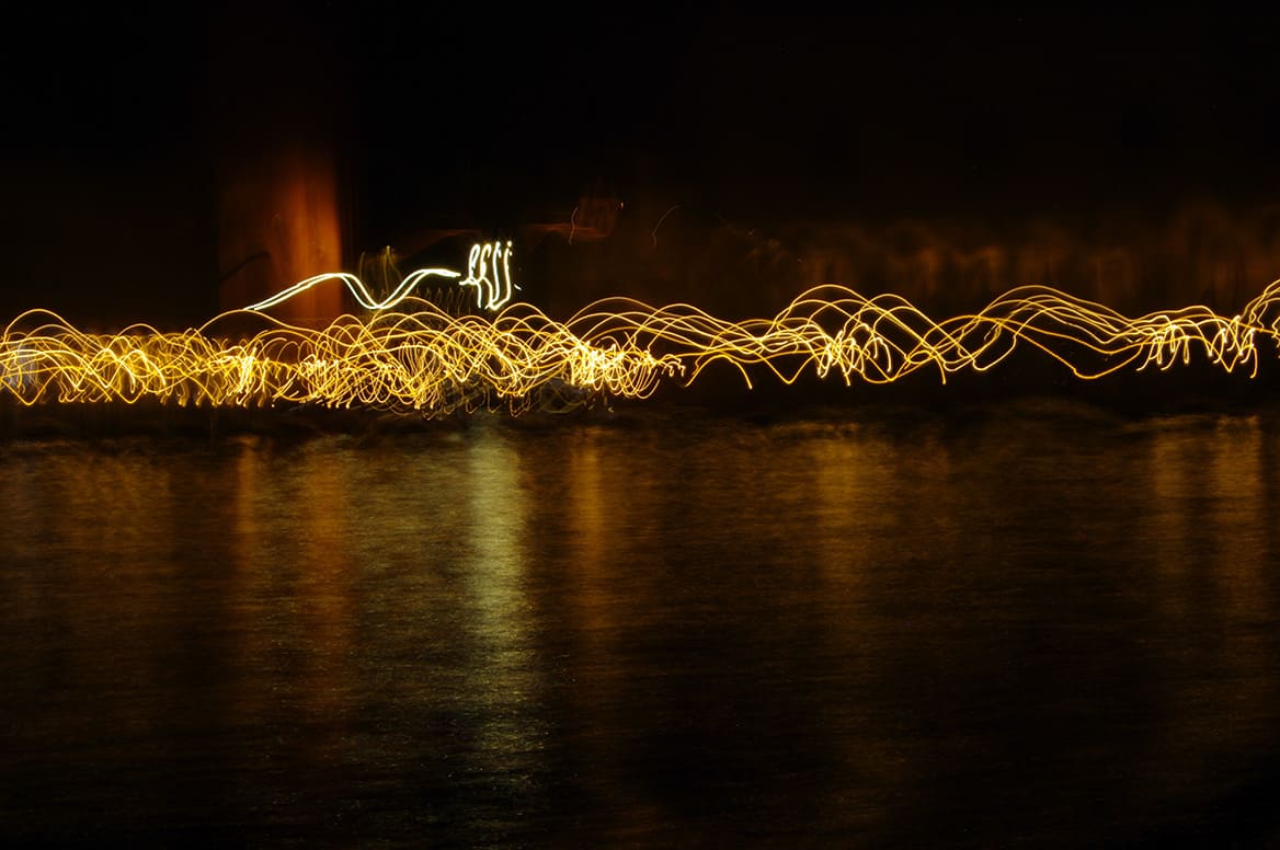 Contrairement aux approches traditionnelles de «light painting», où la lumière principale est ajoutée par le photographe et manipulée par une personne de manière intentionnelle, les seules lumières présentes sont celles de l’éclairage public de Venise et les mouvements imprimés sont rythmés par les ondulations des vagues qui portent le Vaporetto.