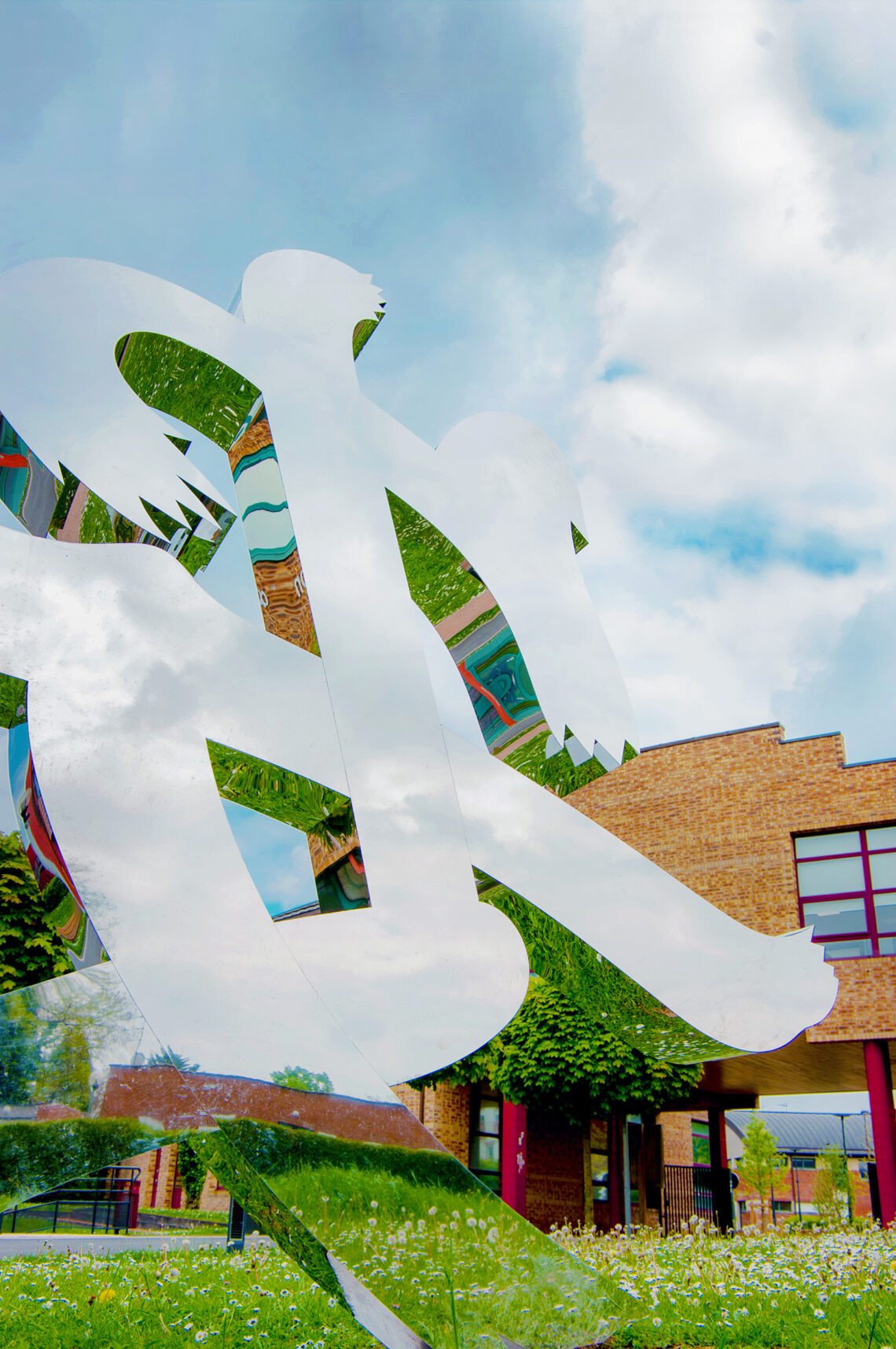 ān – la Paix est une sculpture en inox poli miroir dessinée à partir d’une calligraphie du caractère chinois ān, qui signifie la paix, la sérénité. Ce caractère est calligraphié selon un style cursif, qui a pour particularité de relier les différents traits dans un même geste continu, renforçant l’impression de mouvement dansé.