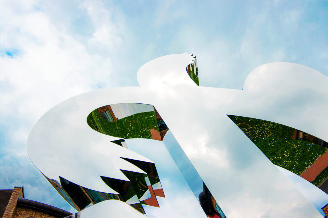 Le jeu des réflexions du miroir fait que notre perception de la sculpture évolue considérablement selon l’angle de vue et la couleur du ciel. Par moments, elle semble se fondre totalement dans son environnement et, à d’autres, nous renvoie notre propre image.