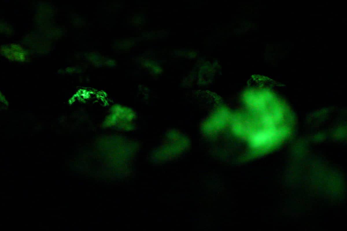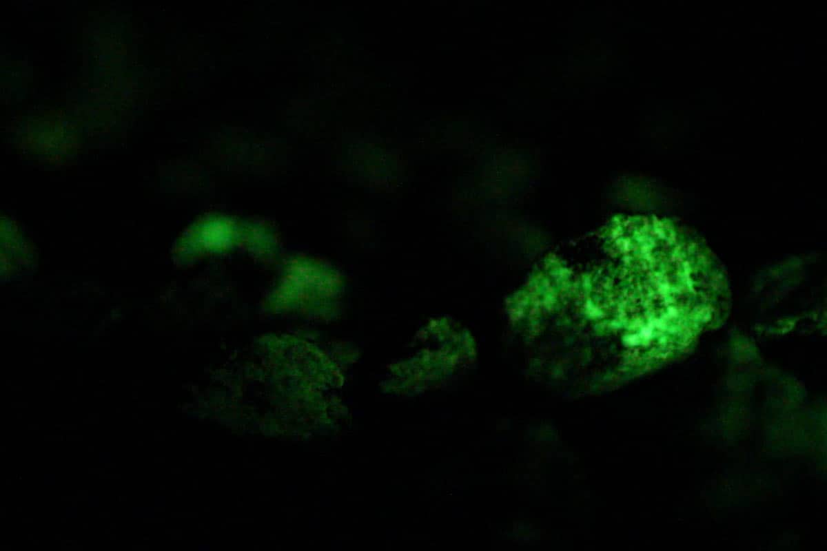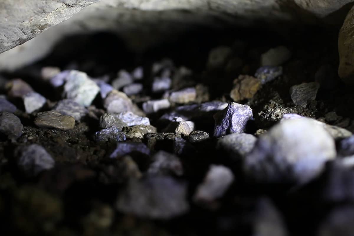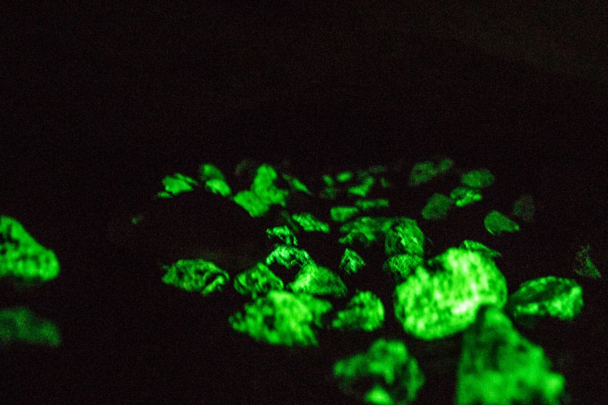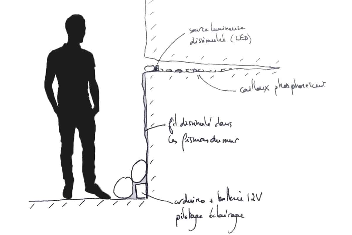 cailloux calcaires, LED, peinture phosphorescente, électronique.