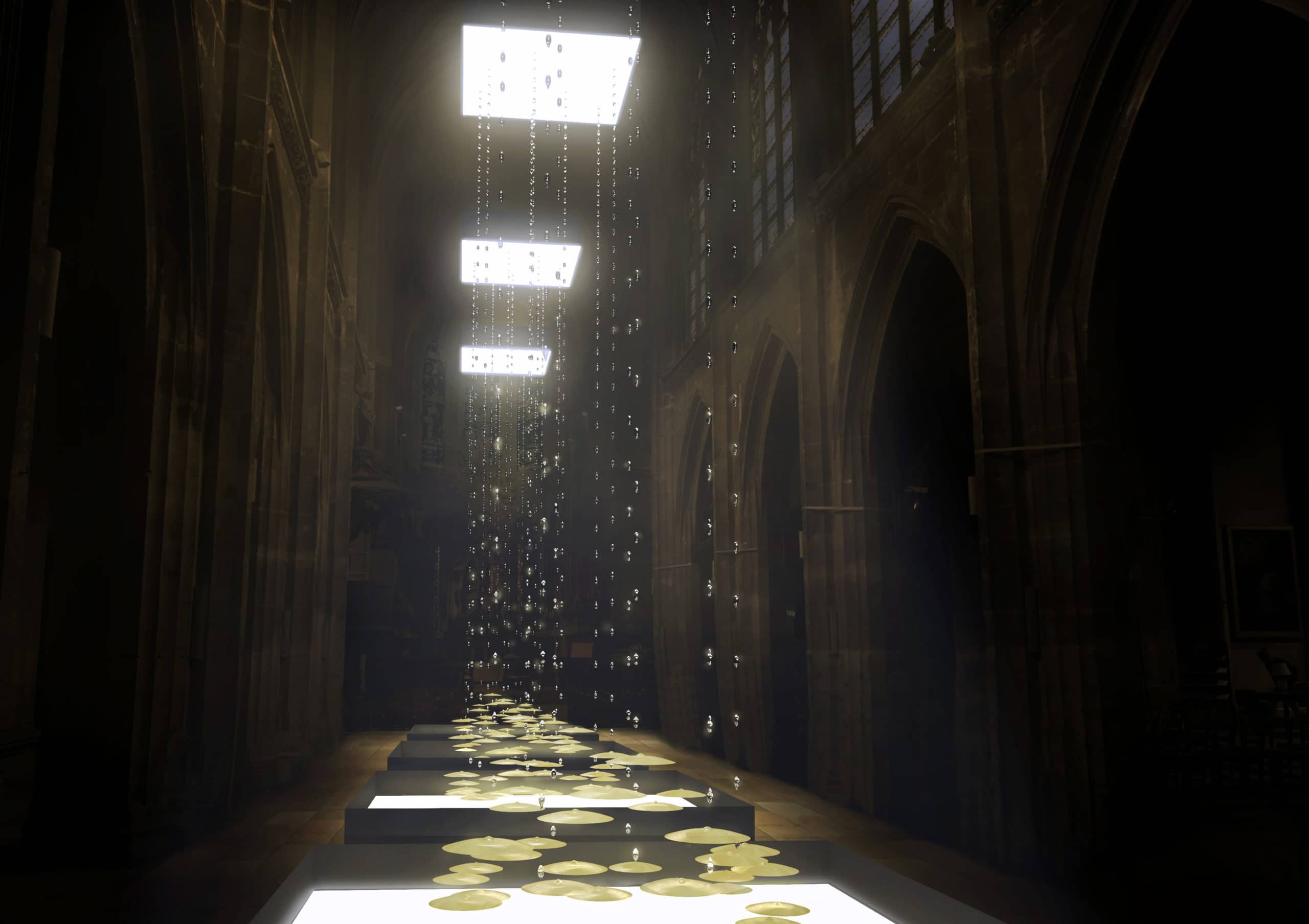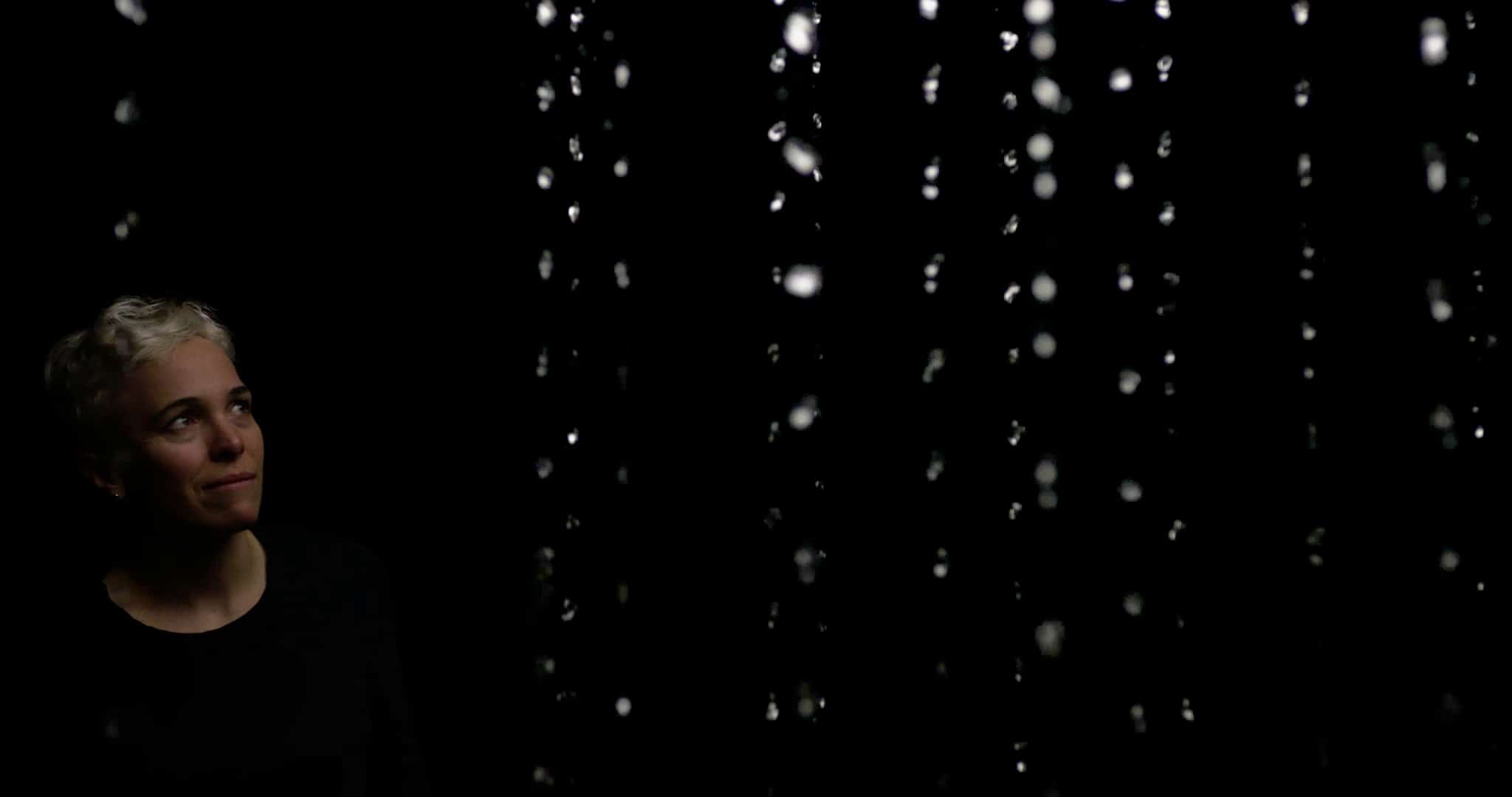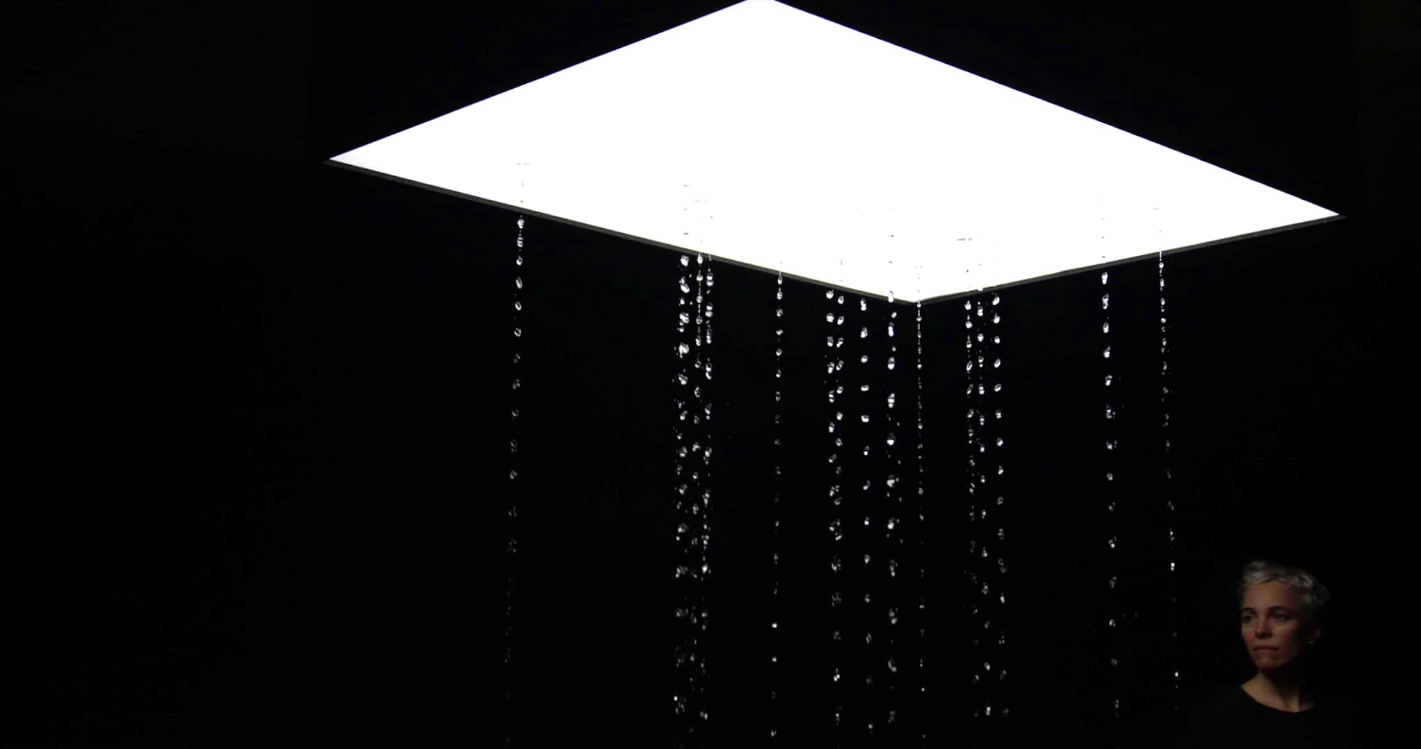 Des filets d’eau s'écoulent d'un objet monolithe noir suspendu au-dessus d’un bassin. Par moment, des filets d’eau se décomposent en gouttes d’eau qui semblent en suspension dans l’espace, comme si la gravité n'avait plus d'emprise sur elles. Certaines gouttes sont immobiles, pendant que d’autres remontent ou descendent lentement. Les mouvements parfois contraires créent des situations perceptuelles paradoxales. Le son de l’eau et la superposition d'ondes sonores très pures envahissent tout l'espace.