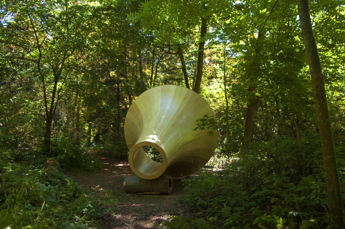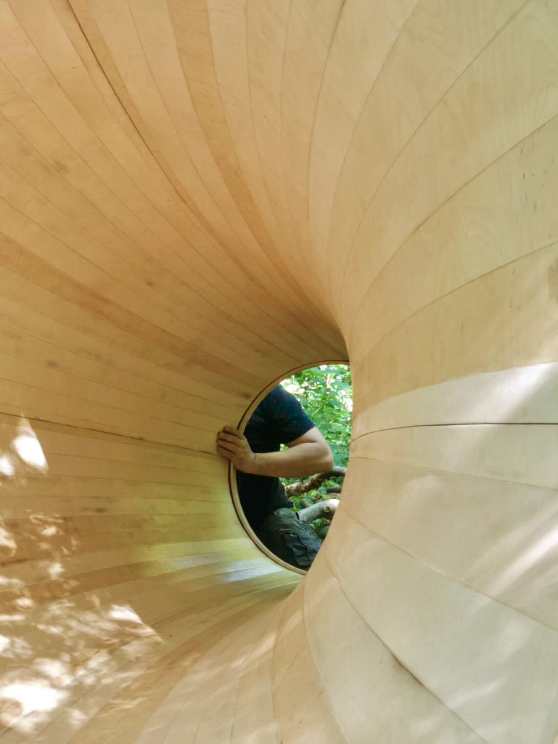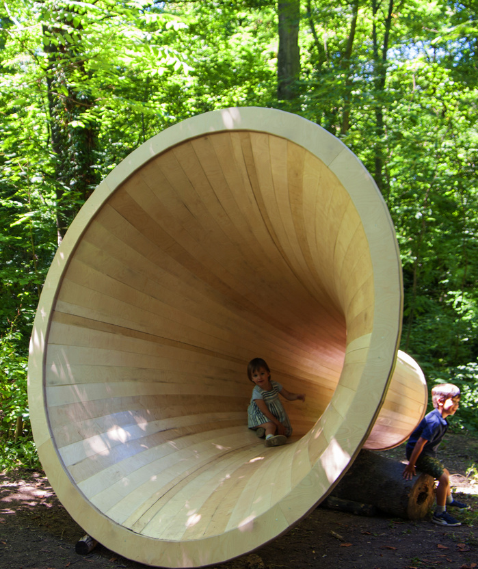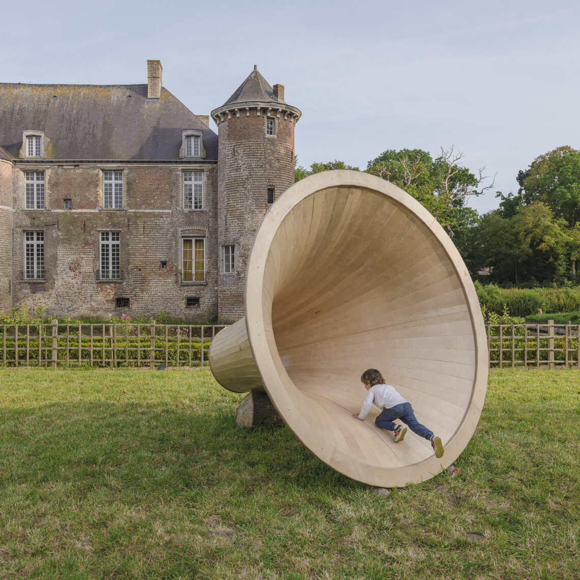 Cette surface en double courbure a été construite selon des techniques navales : une armature a été recouvertes de lattes de bois hydrofuge découpéés numériquement. Très résistante, elle se pratique de multiples façons: on peut s’assoir à l’intérieur et entendre le monde environnant, ou bien écouter par l’étroite ouverture arrière, ou se placer devant le pavillon et ressentir le son qui vient à soi.