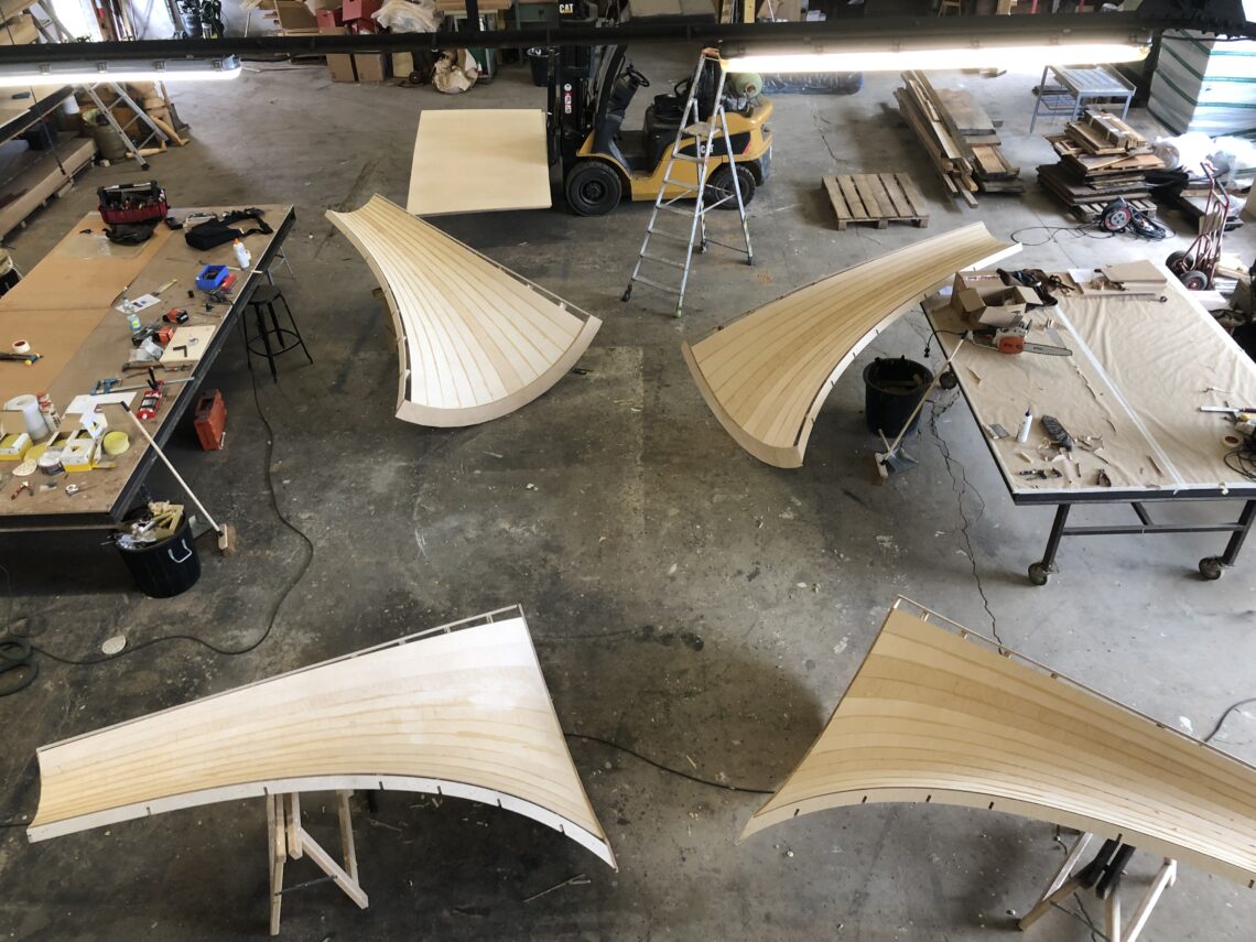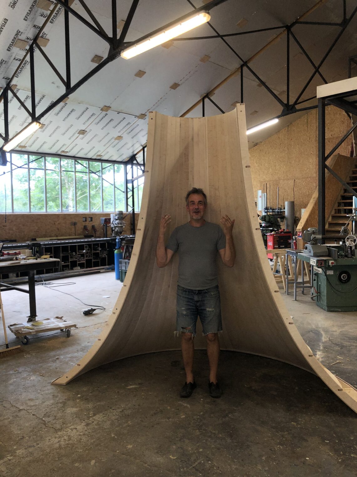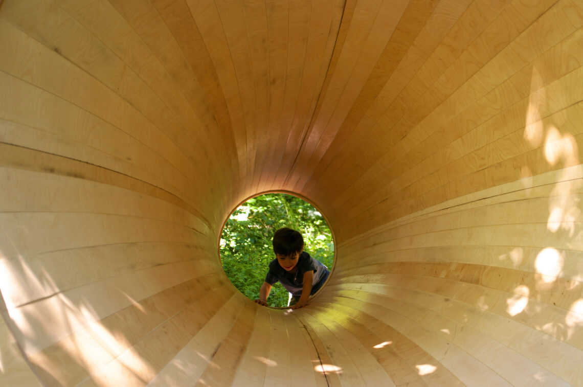 Cette surface en double courbure a été construite selon des techniques navales : une armature a été recouvertes de lattes de bois hydrofuge découpéés numériquement. Très résistante, elle se pratique de multiples façons: on peut s’assoir à l’intérieur et entendre le monde environnant, ou bien écouter par l’étroite ouverture arrière, ou se placer devant le pavillon et ressentir le son qui vient à soi.