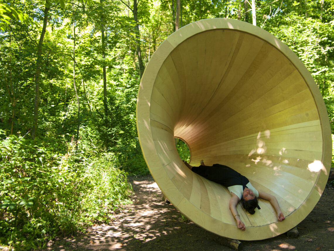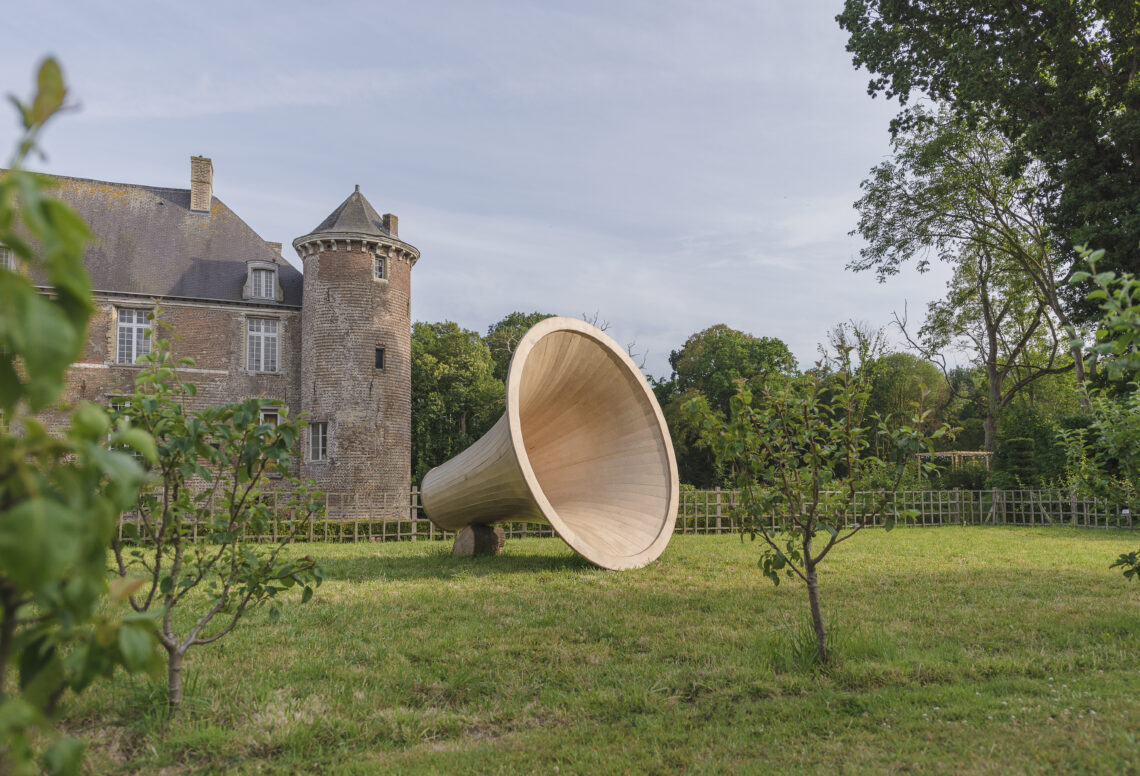 Ce pavillon acoustique invite à une écoute subtile du paysage sonore, dont il amplifie et déforme certains des sons. Sa forme particulière de pavillon acoustique a été étudiée avec des acousticiens, imitant celle des anciens gramophones. Il se produit une amplification naturelle des sons environnants qui varie selon les fréquences sonores. Le timbre des sons se modifie légèrement, attirant l’attention du spectateur vers l’écoute du paysage sonore. Ekhô agit comme un catalyseur de l’attention aux sons de la nature.