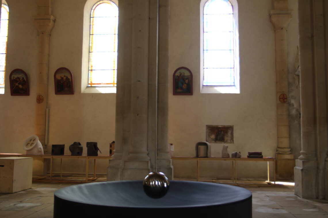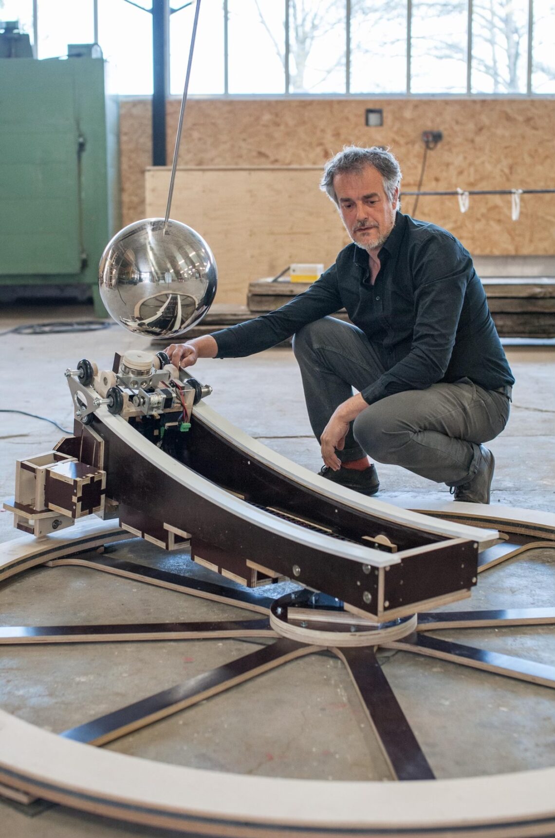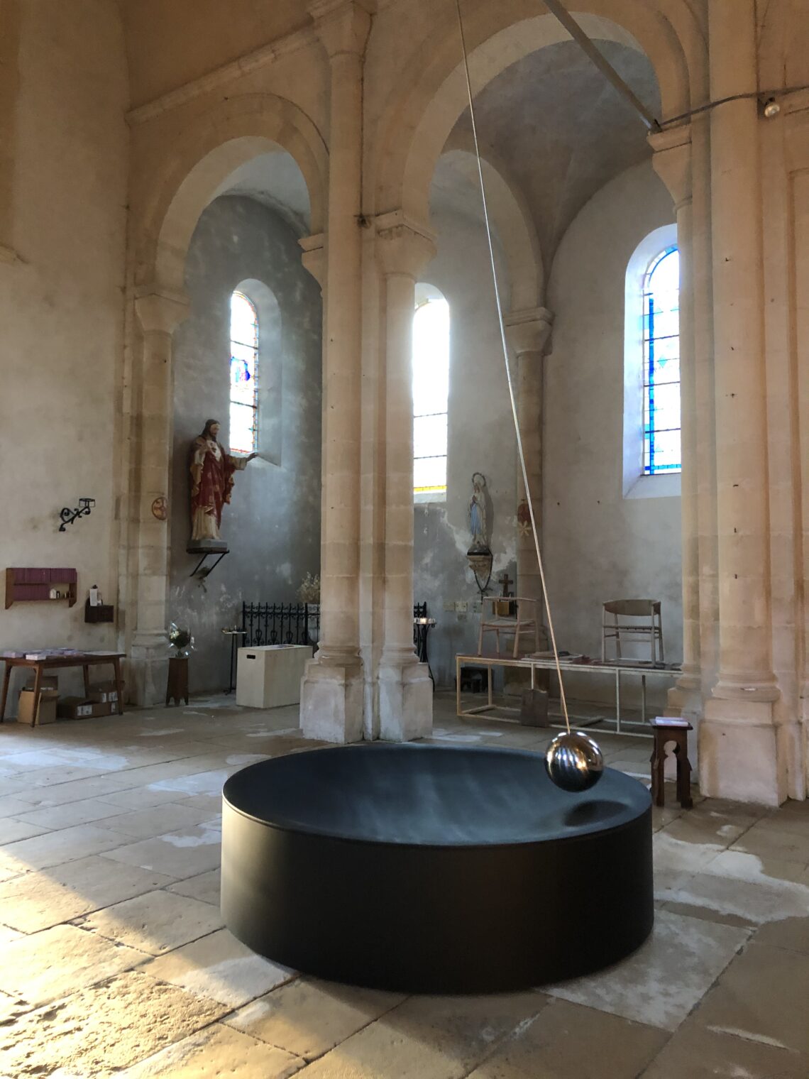The giant pendulum, several meters high, evokes in its form the famous pendulum of Foucault, who offered himself in spectacle to the Pantheon in 1854 to «see the Earth turn» before their amazed eyes, marking the victory of the Enlightenment over «obscurantism medieval». «Hic Sunt Dracones» proposes a new experience, full of mystery: the moment of suspension which occurs naturally at each peak of the oscillation is sometimes prolonged beyond the reasonable, as if the force of gravitation was not immutable, or influenced by the dark matter of the Universe. Unless the pendulum simply succeeds at times in emancipating itself from gravity?