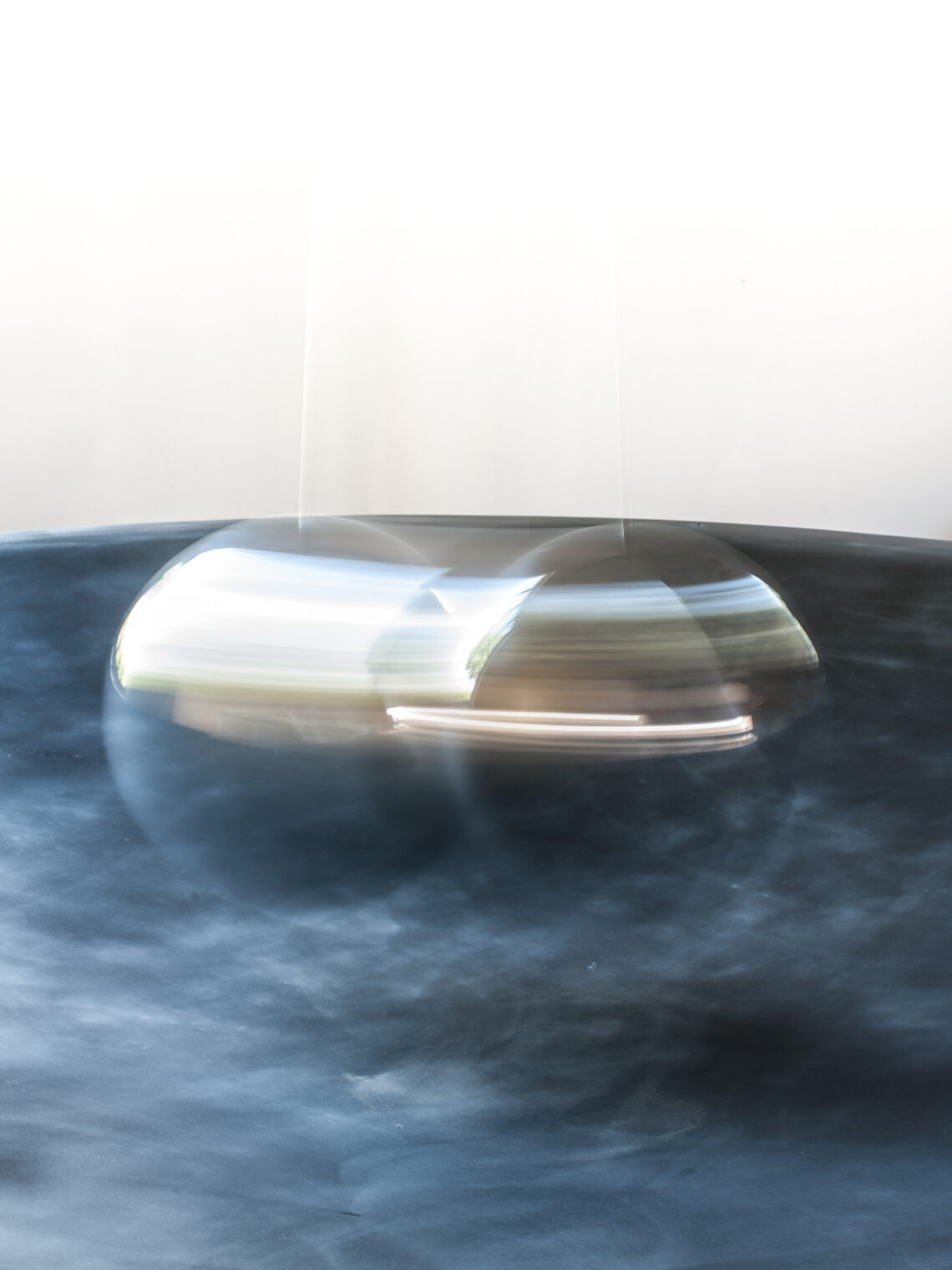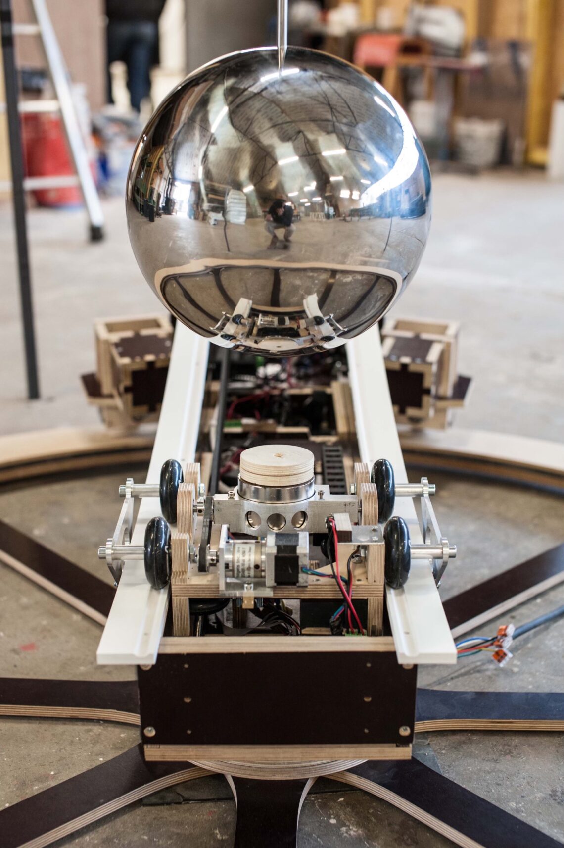 Le pendule géant, de plusieurs mètres de haut, évoque dans sa forme le célèbre pendule de Foucault, qui s’offrit en spectacle au Panthéon en 1854, avec la promesse de «voir la Terre tourner» devant les yeux ébahis du public, marquant la victoire des Lumières sur «l’obscurantisme moyenageux». «Hic Sunt Dracones» propose une nouvelle expérience, empreinte de mystère : le moment de suspension qui se produit naturellement à chaque apogée de l’oscillation se prolonge parfois au-delà du raisonnable, comme si la force de gravitation n’était plus immuable, ou influencée par la matière noire de l’Univers. A moins que le pendule ne réussisse tout simplement par moment à s’émanciper de la pesanteur ?