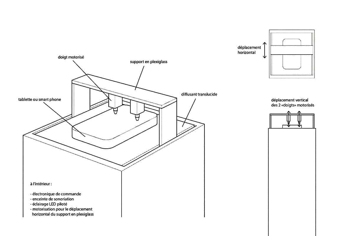 moteurs, bois, plexiglas, LED, enceintes, tablette tactile.