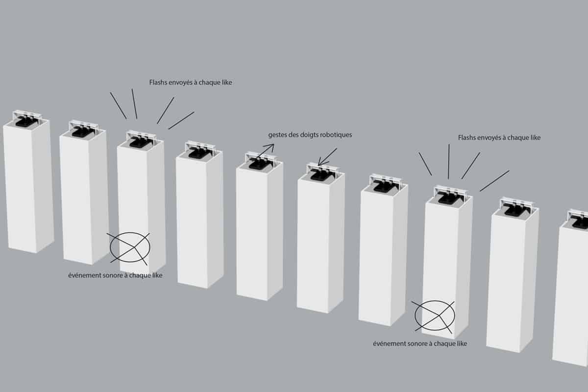 Les robots la likerie sont présentés alignés dans un même espace, recréant une ambiance d'usine robotique suscitant une sensation ambigüe d’inquiétude et de fascination. Leurs mouvements, s’accompagneront de flashs de lumières et des sons de leur respiration, évoquant le « fantôme dans la machine ».