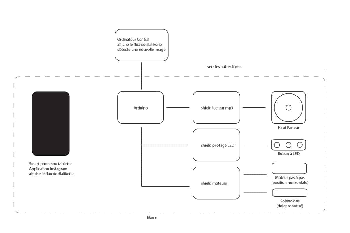 Le principe du projet est simple, toute image postée sur le réseau Instagram avec le hashtag #lalikerie se verra gratifié d'autant de "likes" qu'il y a de robots "la likerie" connectés. Il s'agit de robots physiques : des doigts mécaniques qui cliquent physiquement sur des écrans tactiles affichant l'application Instagram.