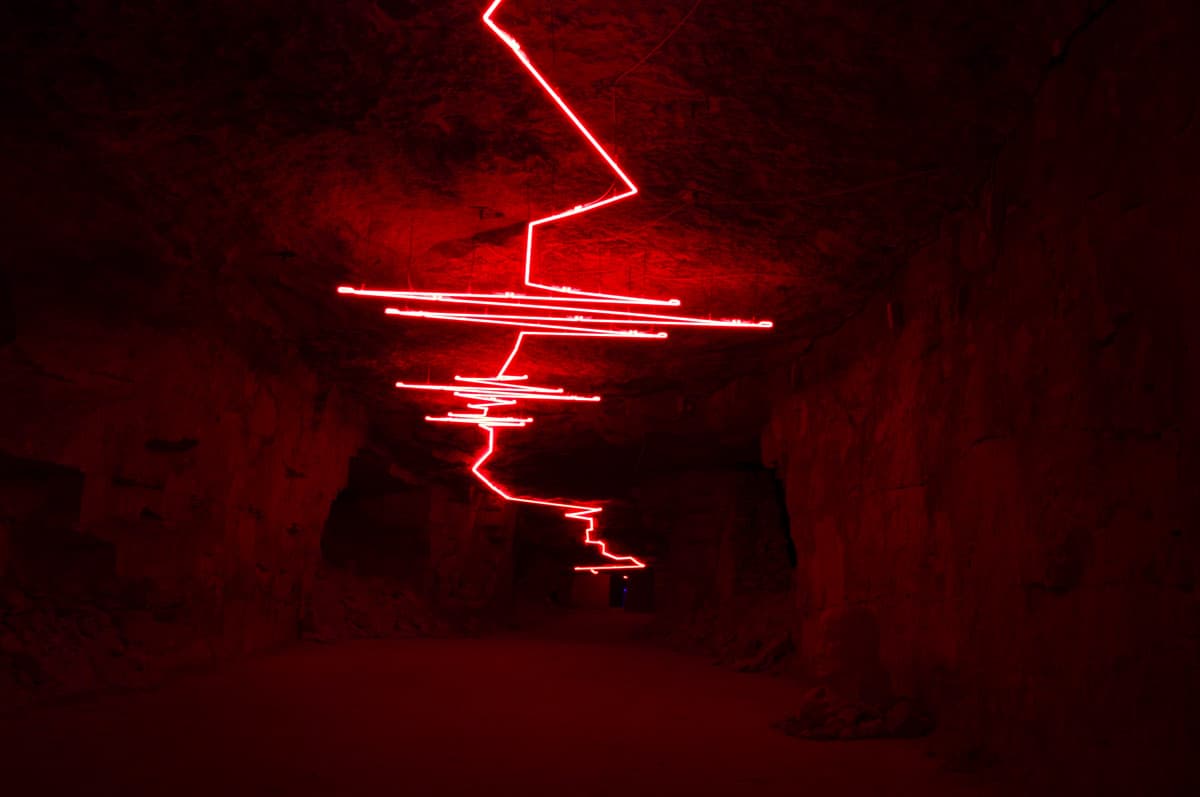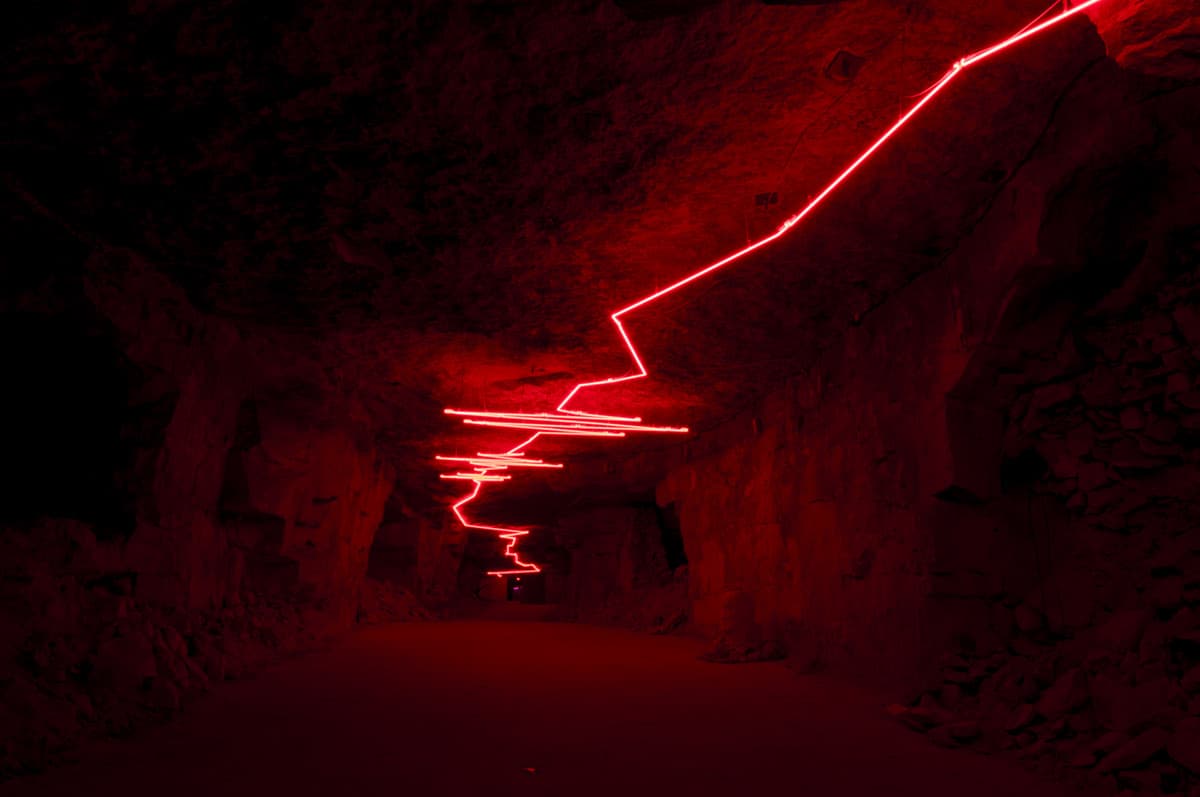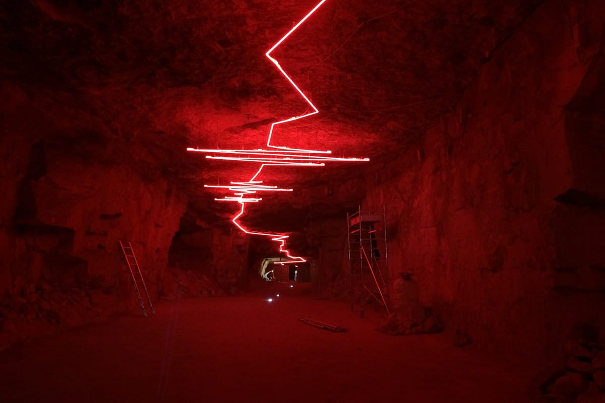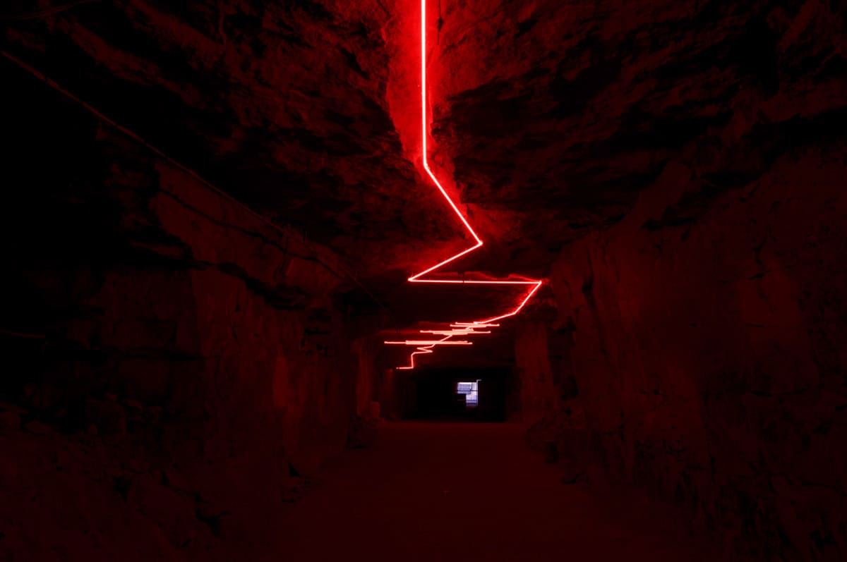 Le néon, une ligne brisée de lumière à la géométrie épurée, se confronte aux nombreuses aspérités de la roche. Cette dichotomie nature/technologie est finalement plus ambigüe qu’il n’y parait. L’espace de l’ancienne carrière a en effet été façonné par la main de l’homme, et le néon de couleur rouge fait appel au pur phénomène d’ionisation de l’air, présent notamment dans les éclairs, dont il domestique la force brute naturelle.