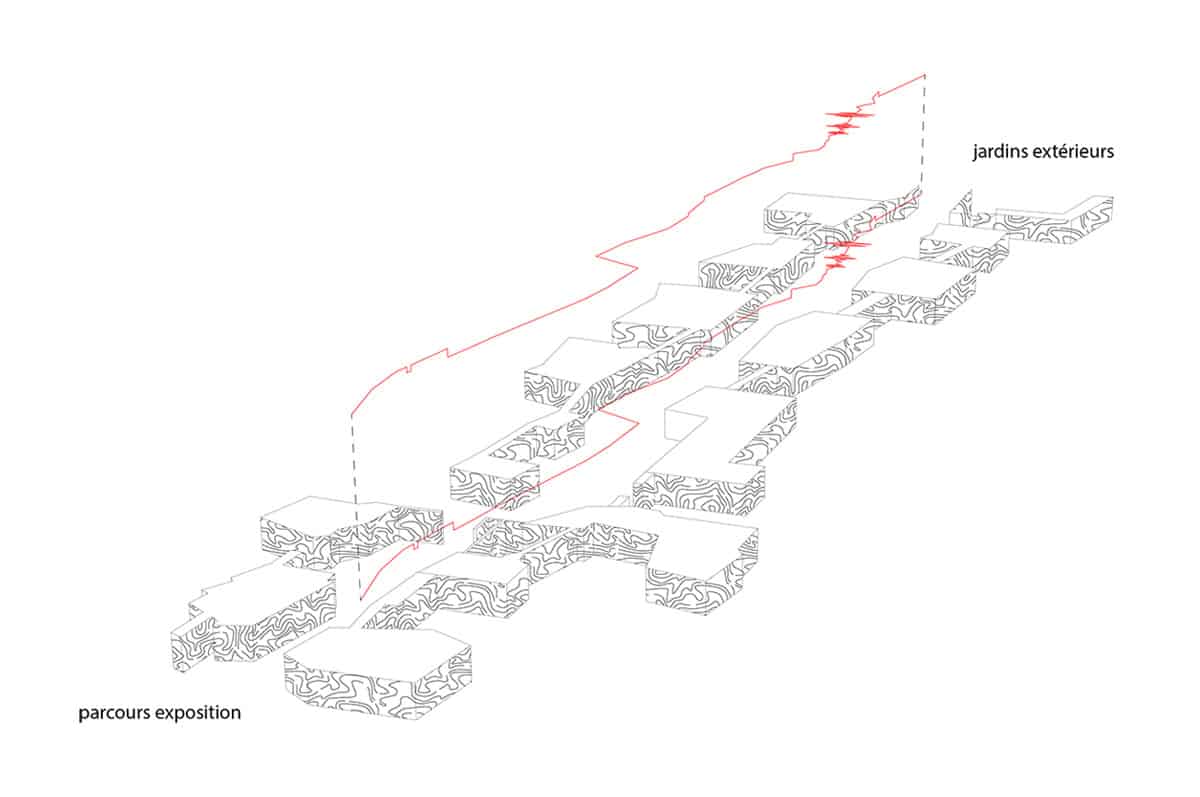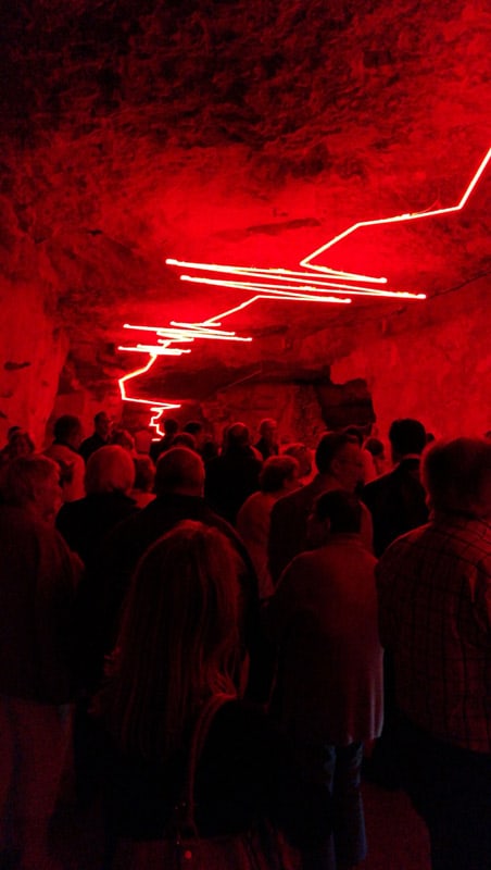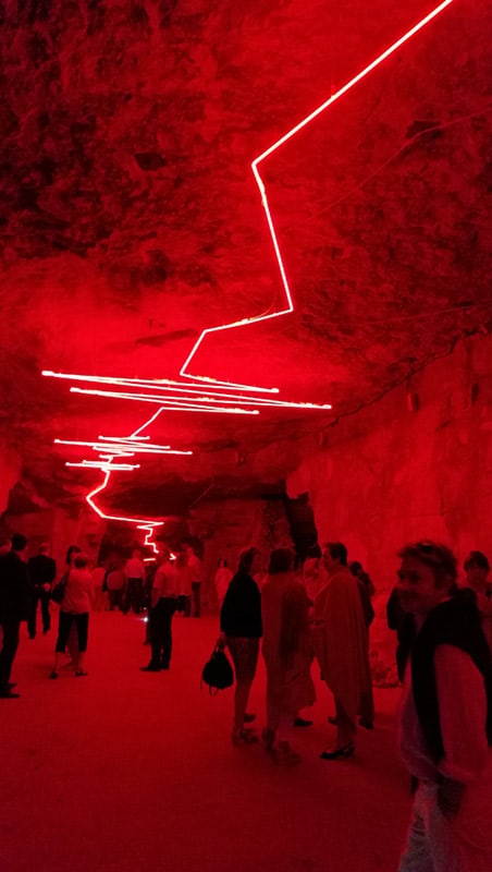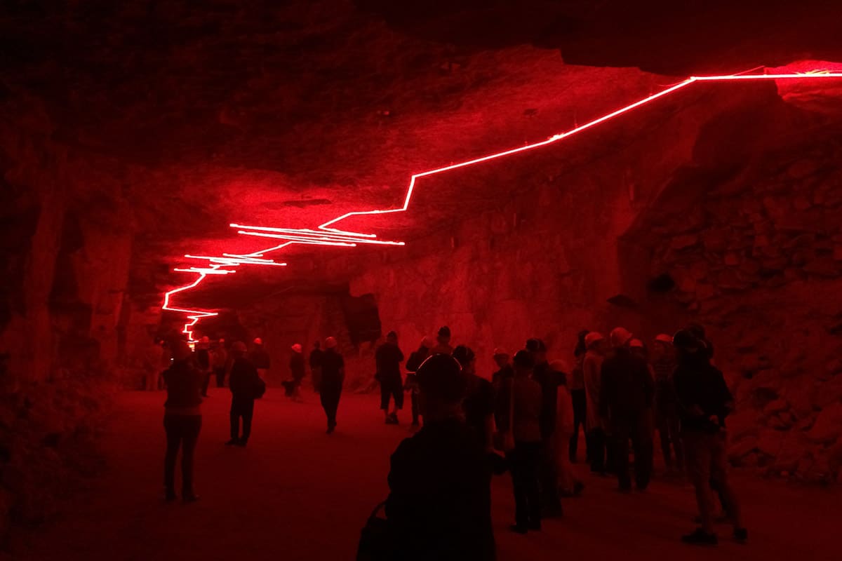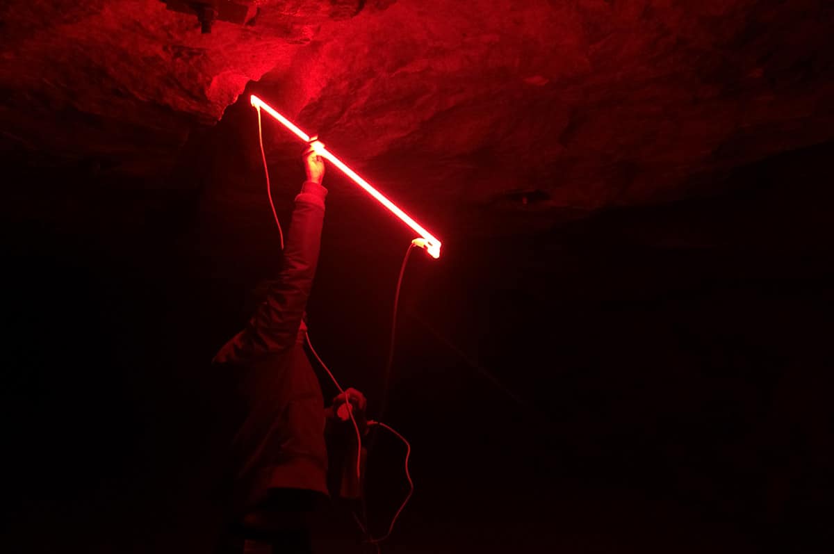 Le néon, une ligne brisée de lumière à la géométrie épurée, se confronte aux nombreuses aspérités de la roche. Cette dichotomie nature/technologie est finalement plus ambigüe qu’il n’y parait. L’espace de l’ancienne carrière a en effet été façonné par la main de l’homme, et le néon de couleur rouge fait appel au pur phénomène d’ionisation de l’air, présent notamment dans les éclairs, dont il domestique la force brute naturelle.