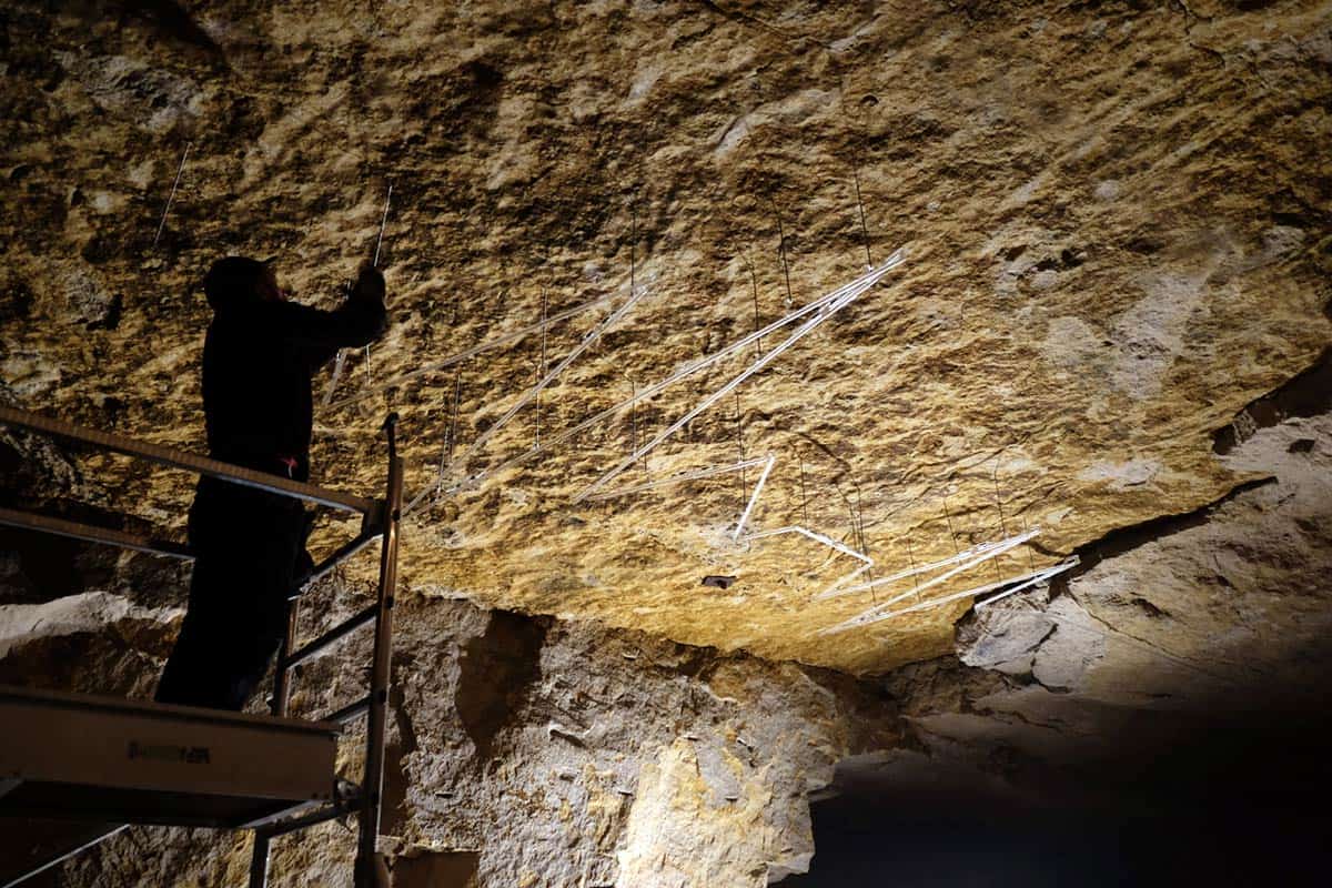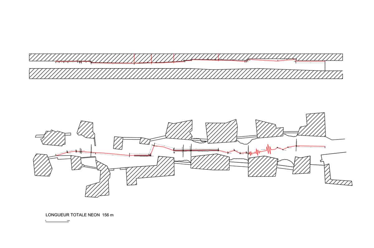 Le trajet de la ligne lumineuse compose avec les failles de la roche, témoins du lent processus de sédimentation calcaire et des mouvements de la terre. En dehors des failles, il suit la forme d'un sismogramme ou d'un encéphalogramme, mettant en relation la vie géologique du lieu avec celle des humains qui l'ont pratiqué.