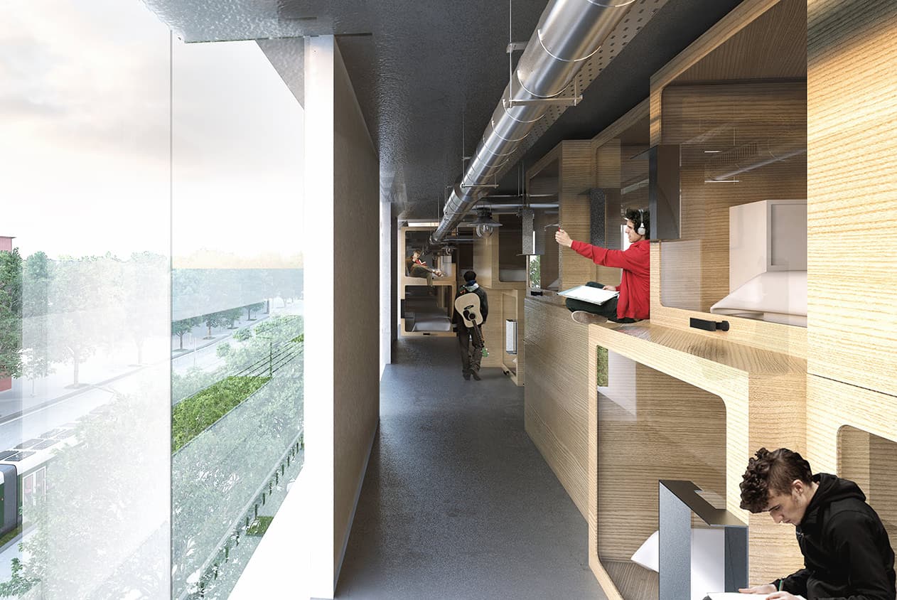 Le projet architectural, co-signé par AR Studio d’architecture et Christian Delécluse, propose une solution d’hébergement temporaire en lits capsule - une réinterprétation contemporaine des traditionnels lits clos bretons – qui permettra d’accueillir jusqu’à plusieurs centaines d’étudiants au début de leur scolarité, au moment où leurs ressources financières sont souvent très limitées.