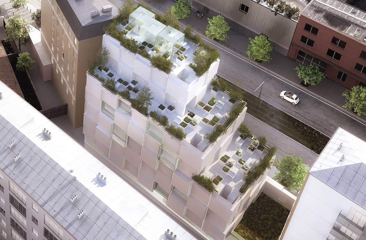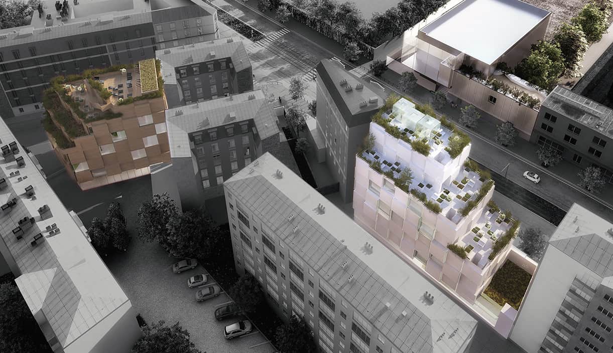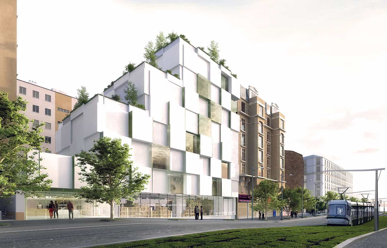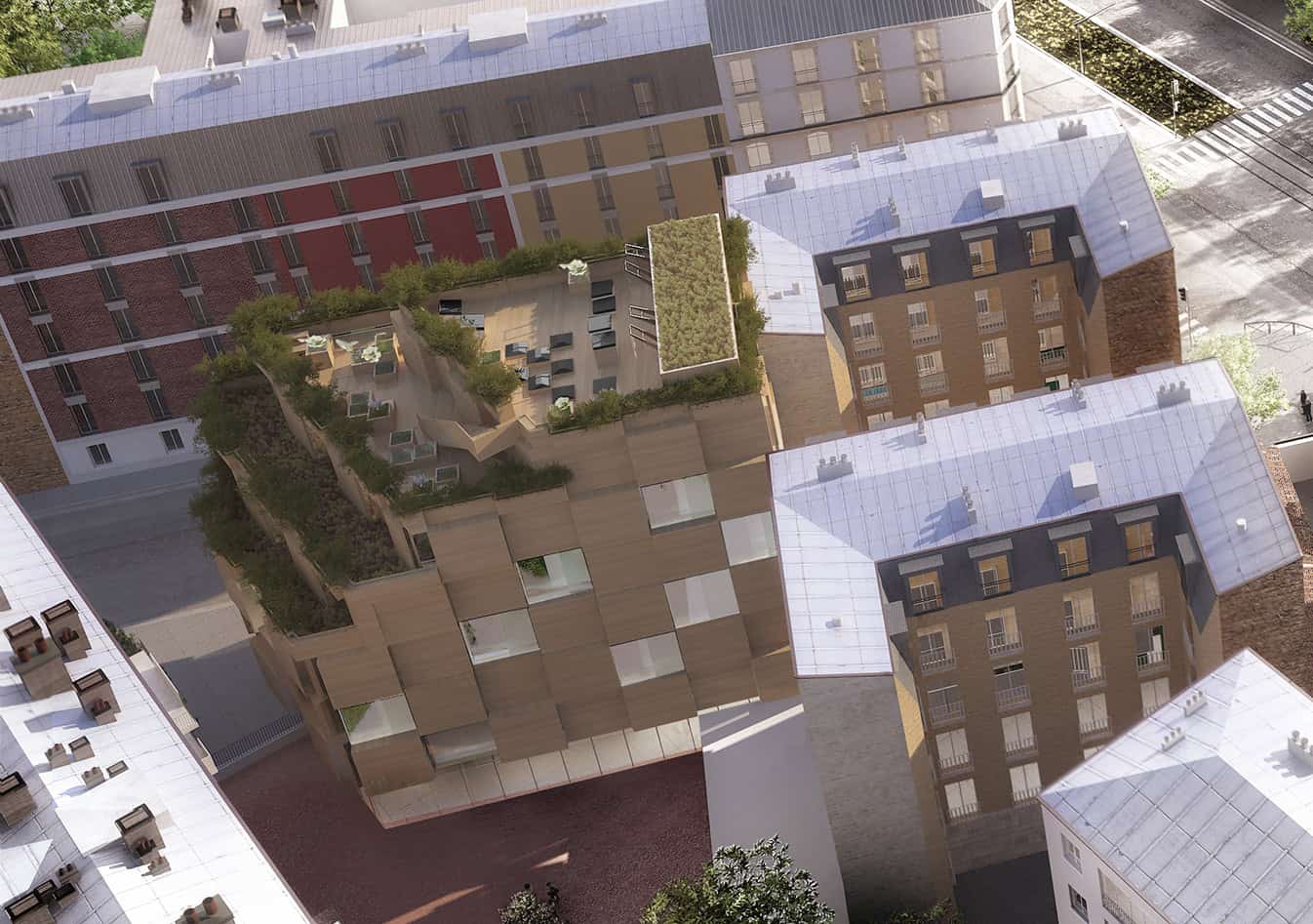 A l’heure où la plupart des Ecoles se délocalisent en banlieue et s’organisent selon une logique de campus, NOC.42 propose au contraire de développer un ancrage territorial fort, de faire corps avec la ville. Le projet intègre des espaces partagés entre les étudiants et les associations du quartier, dont des espaces extérieurs végétalisés, ainsi qu’une salle de spectacle et une épicerie solidaire. Ces programmes participent également aux objectifs pédagogiques de 42 : créer davantage de frictions entre les étudiants et les habitants du quartier.