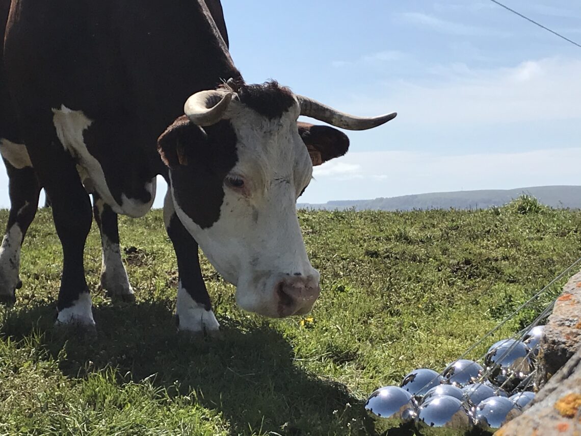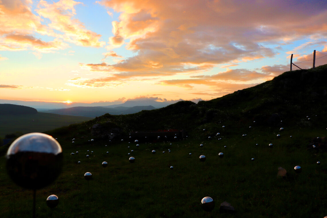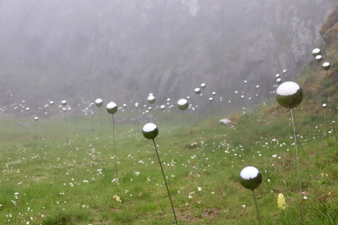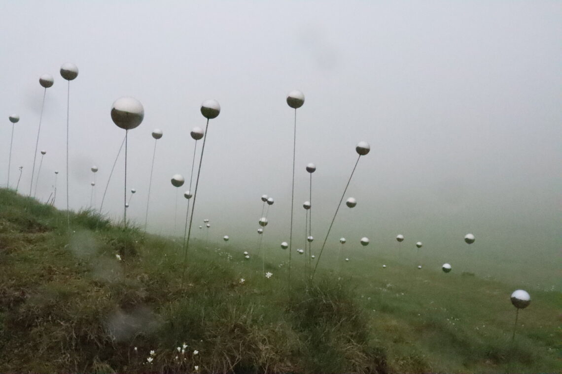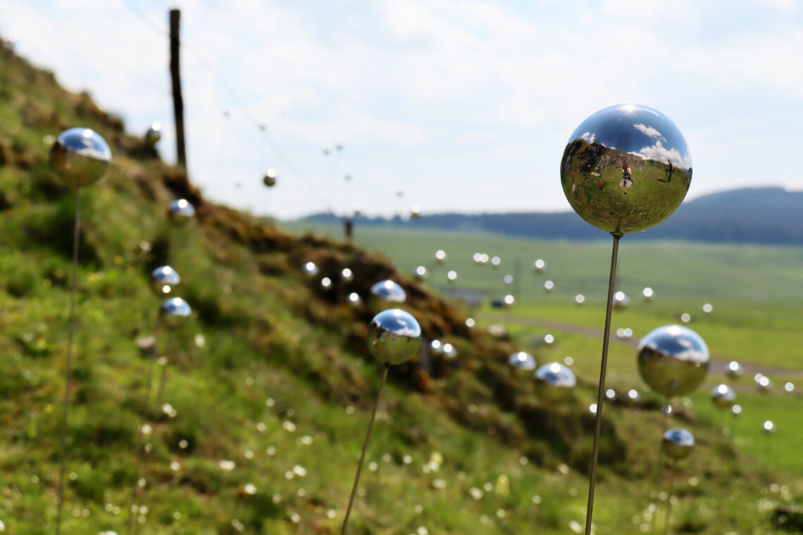 Les boules de qi gong, originaires de Baoding en Chine, sont utilisées depuis des millénaires en médecine chinoise traditionnelle pour rétablir l’harmonie entre l’humain et son environnement naturel. Placées à l’extrémité d’une tige et disposées “naturellement” dans un pâturage, trois cent boules de qi gong anachorètes se transforment en un jardin de fleurs sauvages artificielles qui oscillent au gré du vent.