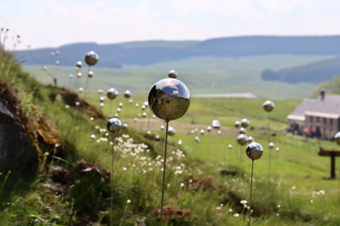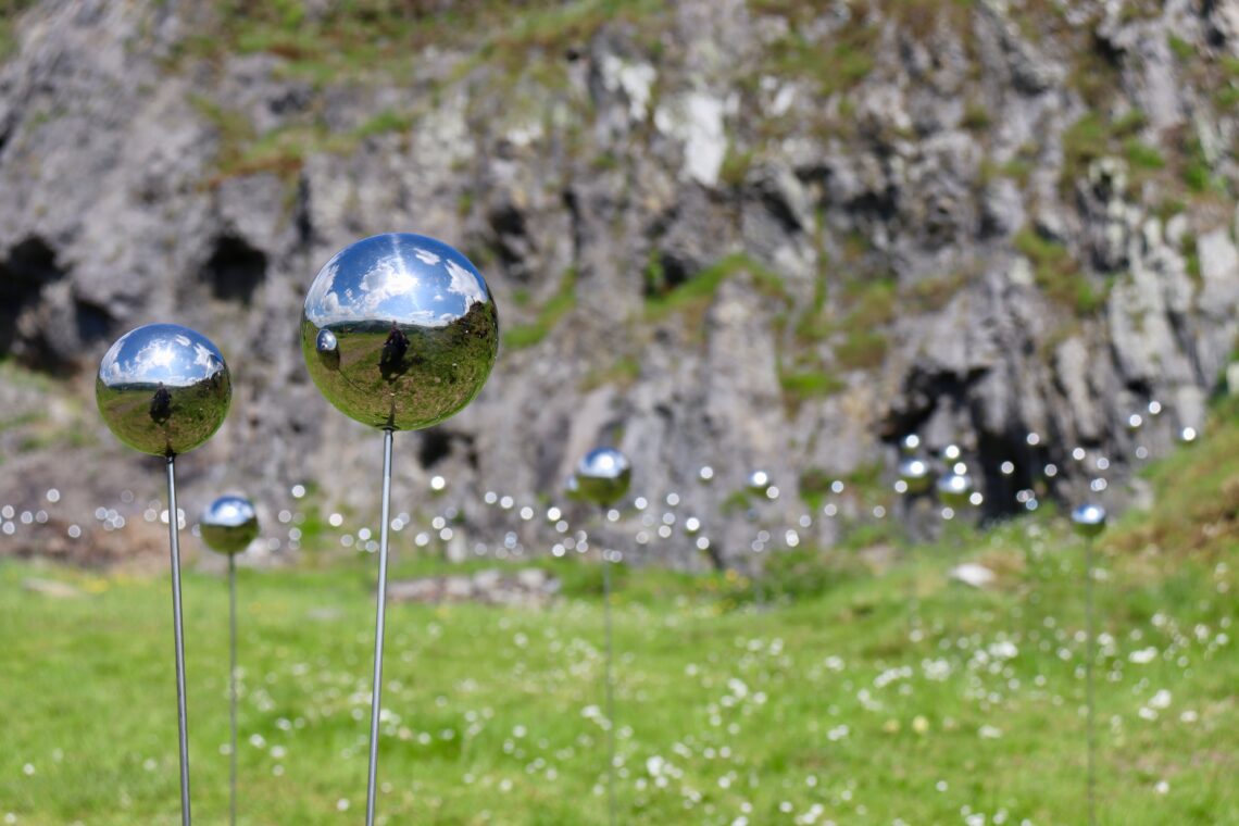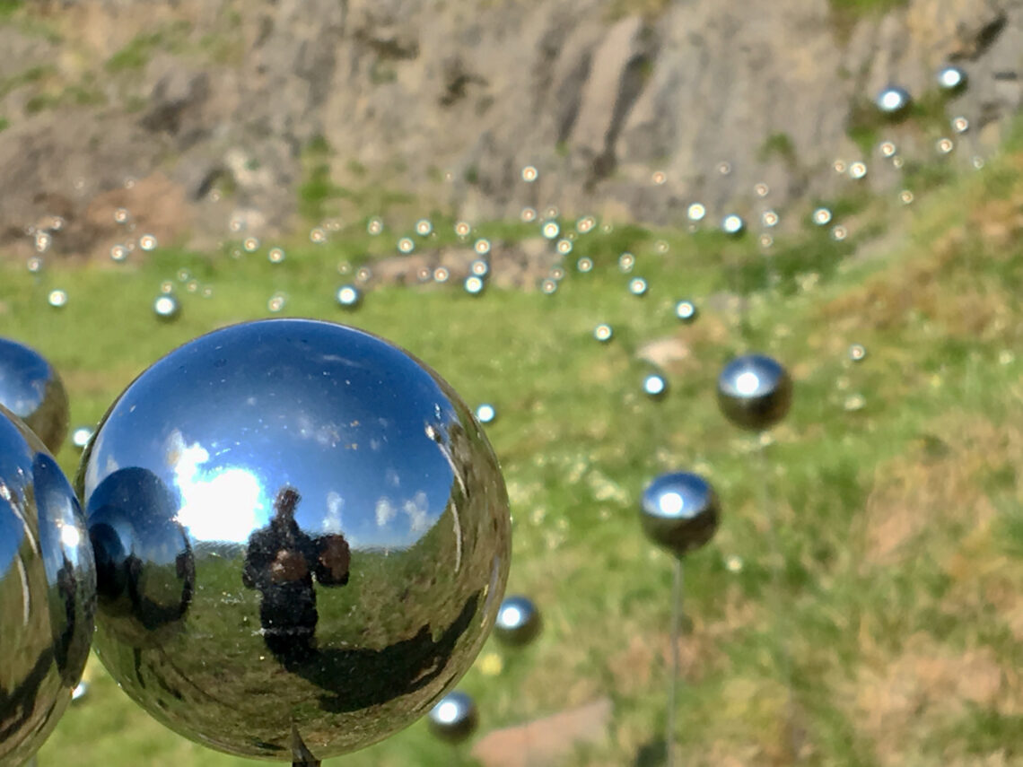 450 boules de qi-gong en inox poli miroir sur tiges inox. surface de 200 m²